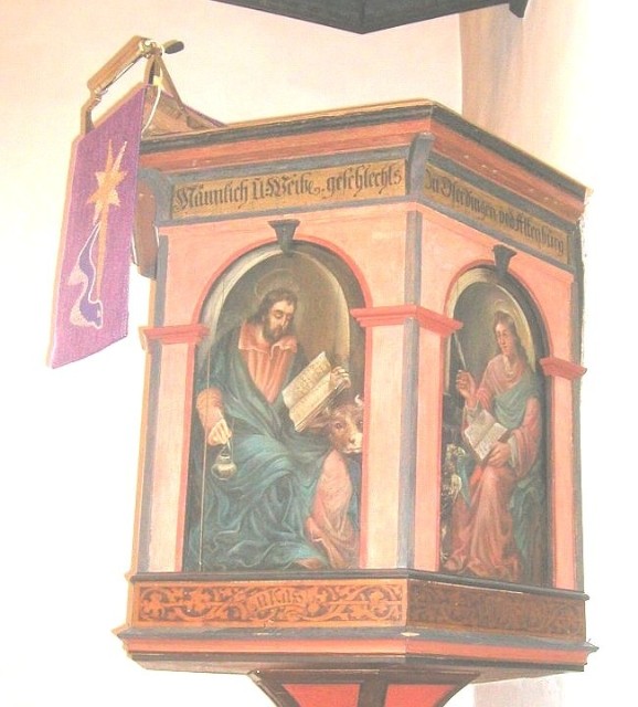 - Löwe = Markus; das Evangelium beginnt mit dem Täufer Johannes, dem "Rufer aus der Wüste"; Markus wird auch mit dem Löwen dargestellt, weil im Auftreten Jesu die messianische Zeit des Friedens beginnt, in der Kalb und Löwe nebeneinander auf der Weide leben können, weil der Löwe Gras frißt.