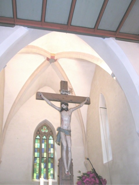 Der Chorraum (Altarraum) ist viereckig gehalten und mit einem Kreuzgratgewölbe versehen. Die Grate im Chor waren einmal mit Rankenwerk und Blumengirlanden bemalt. Ein Rest davon konnte bei der Restaurierung noch ermittelt werden.