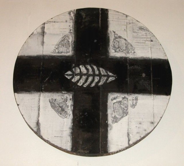 Eine Kunsttafel von Dieter Mammel: "Kreuztisch" = Das Kreuz mit den vier Evangelistensymbolen (?)