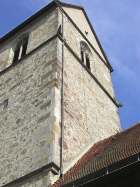 Der Kirchturm der Clemenskirche wurde aus gehauenen Sandsteinen (an den Ecken) und aus Felsbrocken (in den Mauern) erbaut.